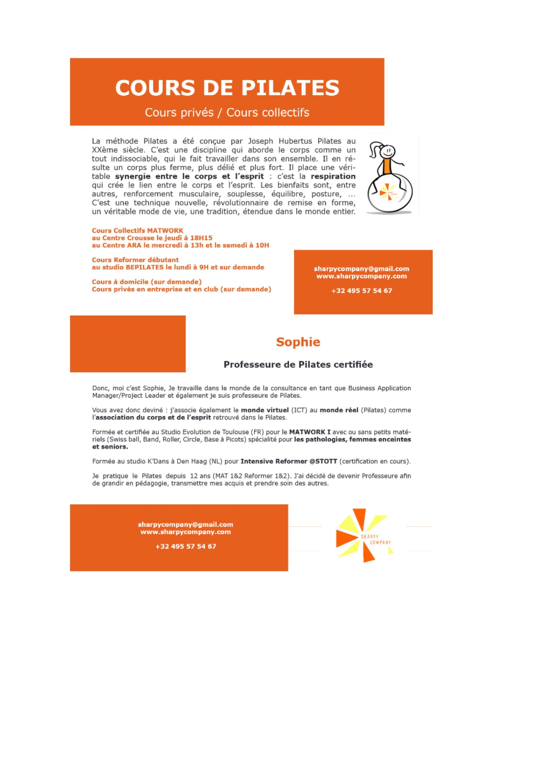 Pilates : Ioana (Instructeur Pilates Certifiée) : 0489.687.223 – Ou ioanaspilates@yahoo.com.
